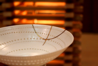 普段使いの食材や飲料を入れない陶磁器・ガラスにお勧め エポキシ樹脂とアルコールを使って継ぎます。金粉や銀粉を練り込み、透けて見えるガラスの破断面なども美しく修理できます。 花器や小物入れなどに最適です。 焼き継ぎとちがって焼成を伴わないので更に安全安心です。 |