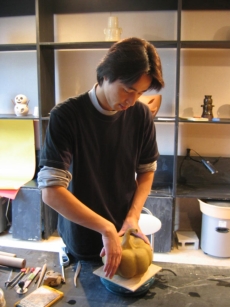![]() 電動ロクロで袋物を成形し、指で押してかぼちゃに変えていく |