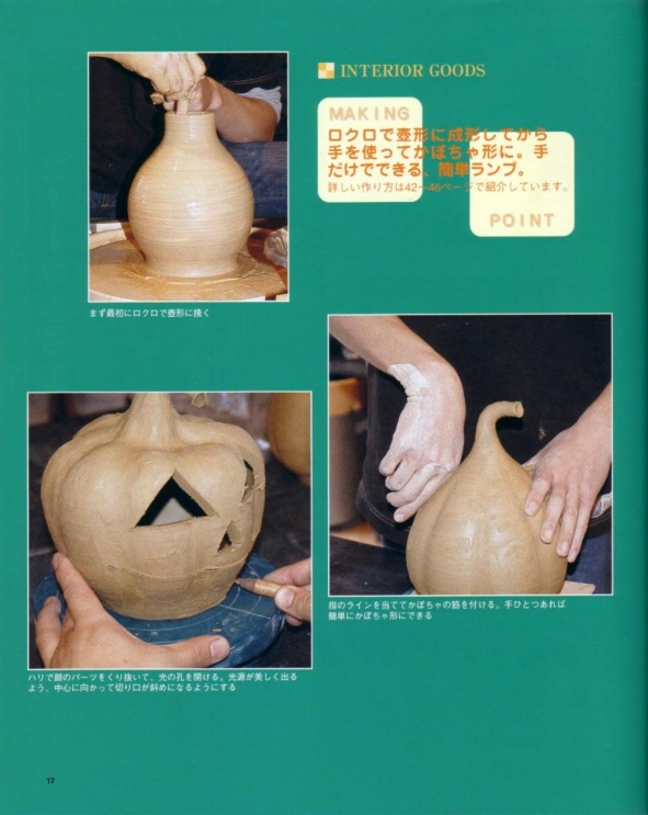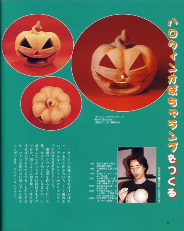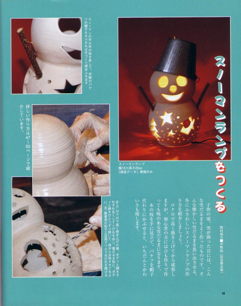 新企画社より毎月発刊(全国で三万部)されている陶芸専門誌「陶遊:12月号」に彩泥窯が掲載されました。 掲載の特集は、『手作りで盛り上げよう、キラキラ★クリスマス』だそうです。 今回の取材では、ハロウィンのかぼちゃ提灯と雪だるまランプが掲載されました。 平成17年11月発売 取材の様子 |