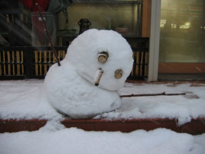 ![]() 前々日、8年ぶりの大雪。融けかかった雪だるまに見守られて取材スタート。 |