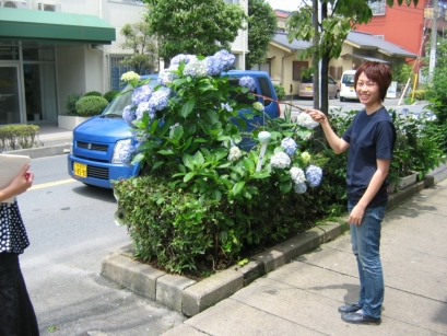 ![]() 紫陽花をバックに撮影。でも掲載は八月号なので、このショットはボツになるとか・・・ |