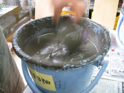 | 素焼生地を研磨、蝋抜き後、釉薬を決めて施釉 (約一時間) |