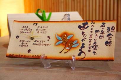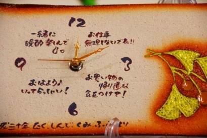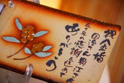 | 金婚式のお祝いをお手伝いさせていただきました。 笑顔が素敵なご夫婦です! お茶碗の外側は、金婚式にぴったりな 温かみのある黄色を選んでいただきました。 内側には金豆もデザインしてあります。 |