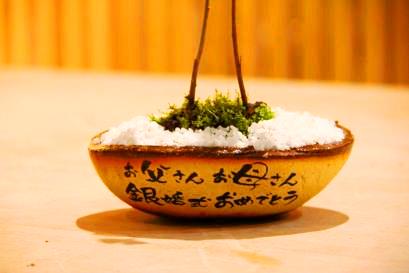 | 金婚式のお祝い 二人の良好な関係が50年の時を経て実を結ぶ金婚式。 彩泥窯では50年の愛情の結実を金豆(きんず)をモチーフにデザインしました。 金豆の花言葉は「円満な関係」、「明るい愛」。これらはまさに金婚式を迎える 二人に相応しい言葉. |