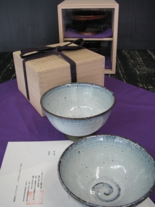 作品は贈呈にも収納にも使える桐箱に紫布と若草布に包んでお渡しします。 | 作り主様の制作のご様子から茶碗のお取り扱い方法、割れ欠けなどのアフターサービスについて記載している、贈られ主様へ対する証書です。手作りプレゼント教室信頼のブランド、彩泥窯で制作された証明書をお付けします。 |