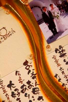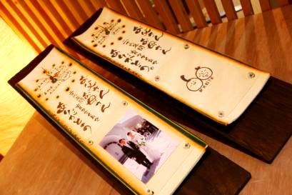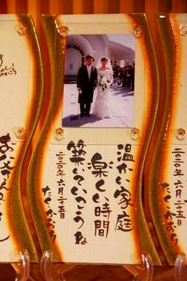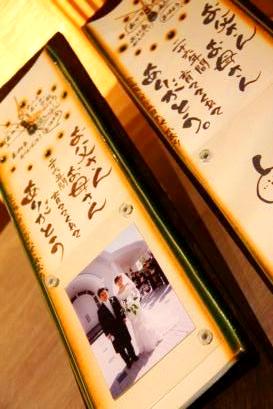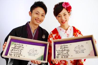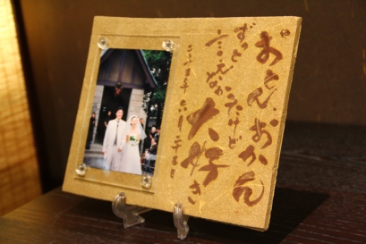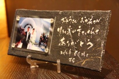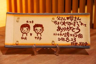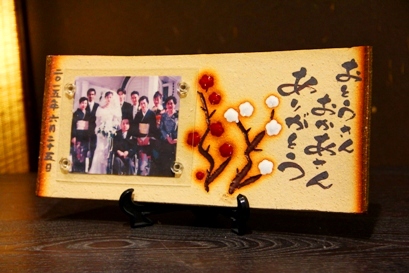 ![]() 若竹の内側をイメージした陶板。 和装婚にはぴったりのデザイン。 竹の子の皮のような茶色く焼いた桐の板もセット。 |