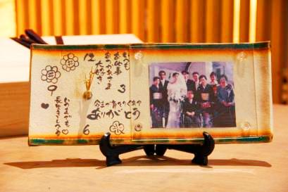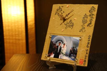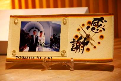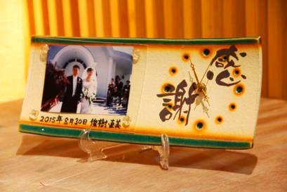 超こだわりの自作の陶器ギフト 初めての方でも楽しくしっかりと制作できるように、熟練の陶芸士がサポートしながら制作して頂きます。お二人らしい味わいのある時計陶版が完成します。時計の陶板の表面には、直筆で感謝のメッセージや絵を入れられます。作品は彩泥窯で焼き上げてアクリル板を付けます。桐箱にお入れしてお渡しします。 オプションで時計を付けて時計付写真立てにもできます。