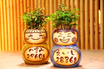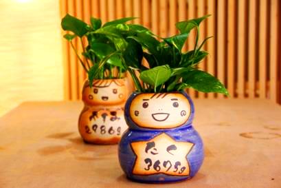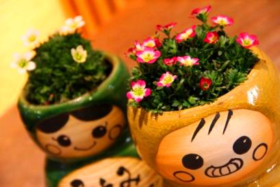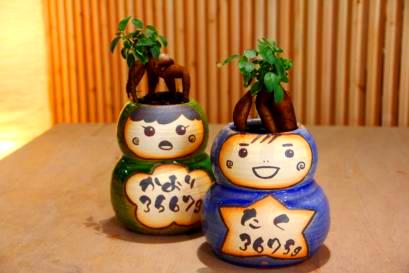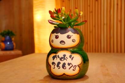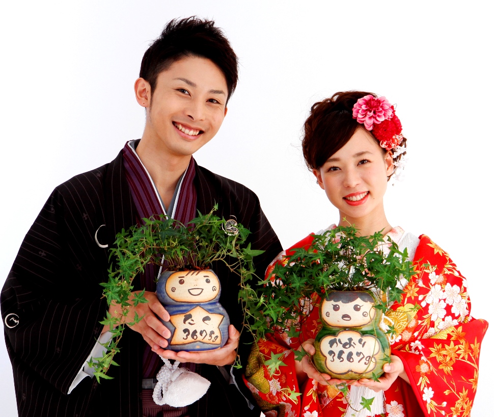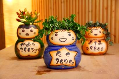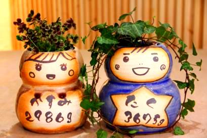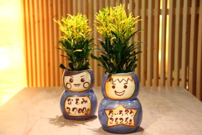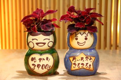 こだわりのメッセージやデザイン、色、植物、思いのまま。二人が思い描いたデザイン、似顔絵をを彩泥窯が形にしてお届けします。オーダーフォームより記入してお送りください。 | 七日間納期のサンクスドール。耐候性塗料で顔や名前をお入れします。 1、鉢の色を選びます。 2、植物を選びます。 3、記念日と名入れをご指定戴きます。 |