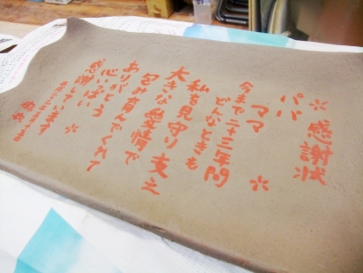 超こだわりの自作の陶器ギフト 初めての方でも楽しくしっかりと制作できるように、熟練の陶芸士がサポートしながら制作して頂きます。お二人らしい味わいのある感謝状の陶板が完成します。表面には、直筆で感謝のメッセージや絵を入れられます。制作物は彩泥窯で焼き上げて桐箱にお入れしてお渡しします。