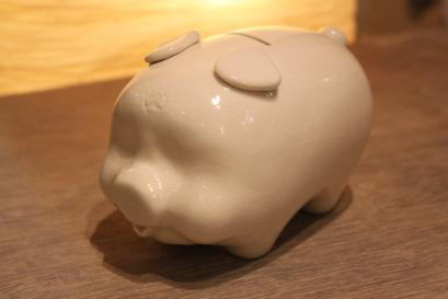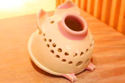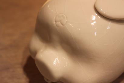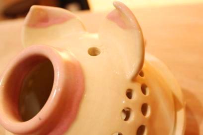 ![]() 豚の貯金箱。よく目にするものは型によって製作されていますが、これは一塊の粘土から掘り出しています。まるで彫刻ですね。 (レシピはメンバーズサイトで 公開) |
