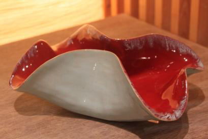 ![]() 還元焼成後、さらに上絵付けを施した器。ランダムに掛けた白萩と、赤と緑の線が響き合い面白い絵になっています。(レシピはメンバーズサイトで 公開) |