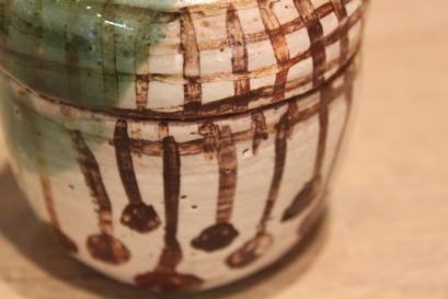 ![]() 鳴海織部の蓋物。粗い粘土、濃淡の激しい鉄絵、動きのある施釉。全体に施されたそれらは、主張こそ強いものの不思議とまとまりがあります。(レシピはメンバーズサイトで 公開) |