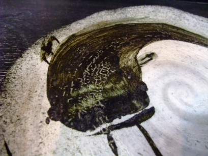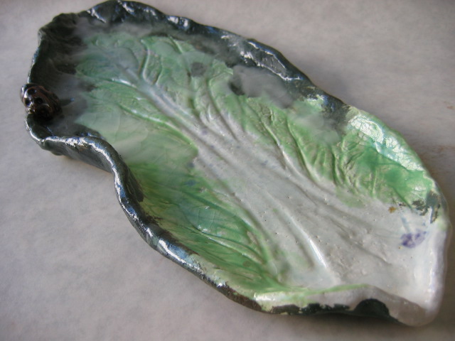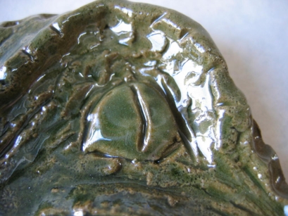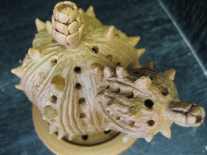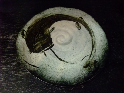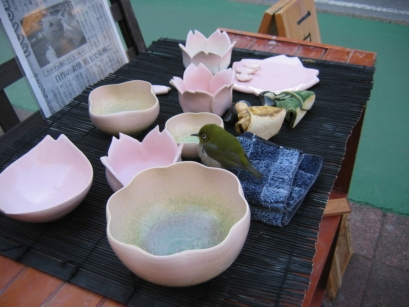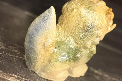 ![]() この作品はお花を活ける水盤なんですが、実物を見ると蛙が水盤の中でスイスイ泳いでいるように見えるんです。ちなみに上にいるのを小鳥です。。。 |