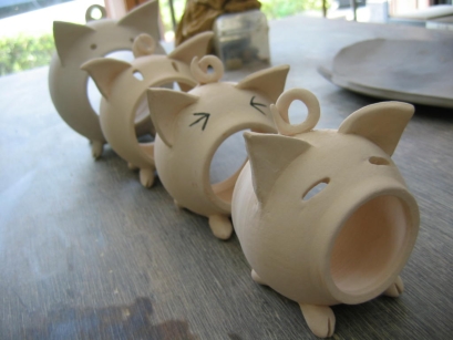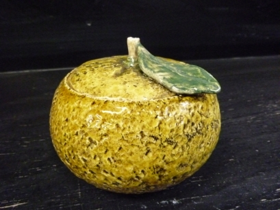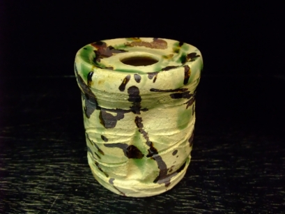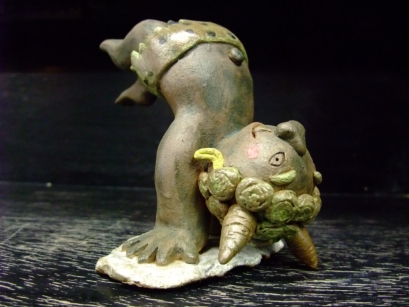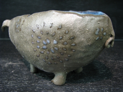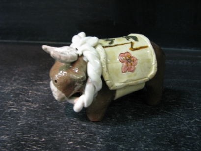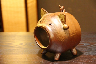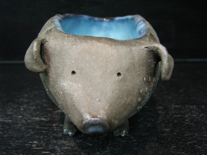 ![]() 超ミニミニ蚊遣りブタ サイズはミニですが愛嬌はビックですね。これだけの小ささですがロクロ成形している難易度の高い作品です。 |