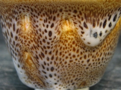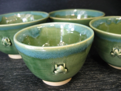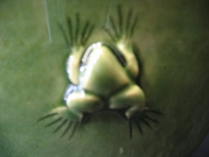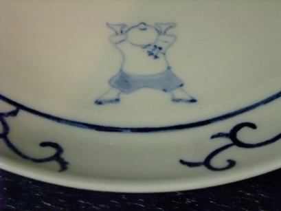 ![]() アマガエルのうつわ 飯碗の側面にしっかりとかき付くアマガエルを発見。太ももの筋肉の表現が見事ですね。 |