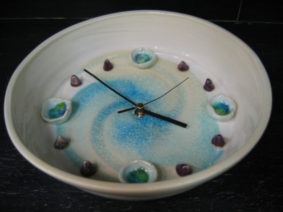 ![]() ガラスで時計を作りました。夏らしく涼しげな逸品ですね。 秒針が長すぎて時間の目盛りに引っかかってしまうので少し曲げてあります。この曲がりが絶品となりました。 |