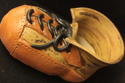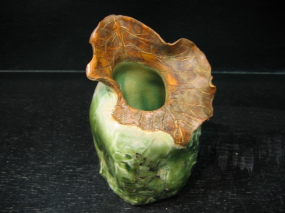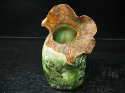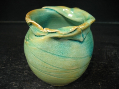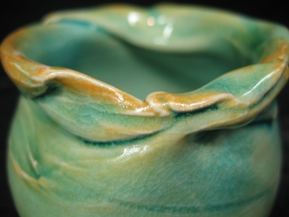 ![]() 電動ろくろでは、土を捉まえながら逃がしていきます。その際、土を捉まえすぎるとこの作品のように口がよれてしまいます。しかし、この作品はそれを逆手にとって造形として残しました。 |