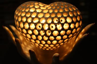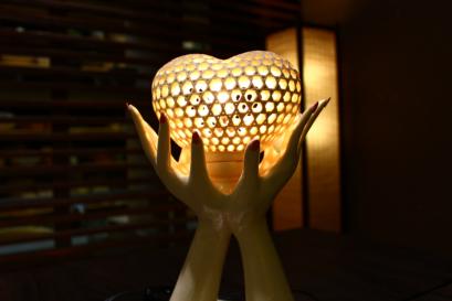 ![]() ハートのランプシェード 薩摩焼の伝統技法である「透かし彫り」を施した作品。 |