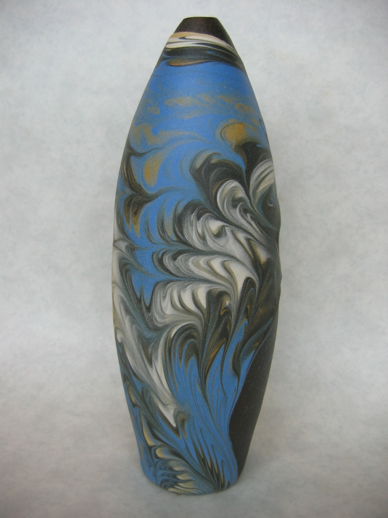 color into mud. Unlike the traditional coloring techniques (such as slipping), the pattern is developed by pouring one ore more color pigments on a vessel at once. It is said that originally, pottery is an art concerned with how well someone can use fire and how well one can make a drawing. But according to this technique, the desired design is produced by the mud itself. The creator has to take into consideration the speed/spread of the color in order to concentrate on creating the desired pattern. The main creation theme is the Auroras (the northern and southern polar lights) expressing the universe's magnetic fields. A thin lower layer of color which is evident over an upper layer of color gives a three dimensional impression to the viewer. This is a new and innovative technique. |