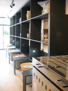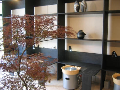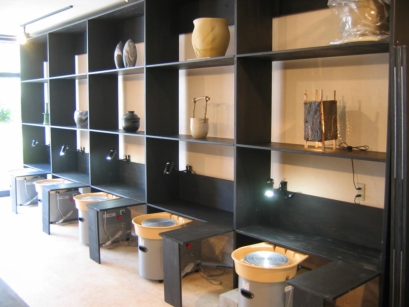 この工房は上級者(彩冶会員)が自由に使える工房で、土作りから焼成に至るまでのプロセスをすべて自分で取り組んで頂くものです。工房内の設備は、そのほとんどを彩泥窯の会員達と手作りで作り上げました。雰囲気も立ち上げ作業も、小さな陶芸家達に支えられたモダンな工房です。